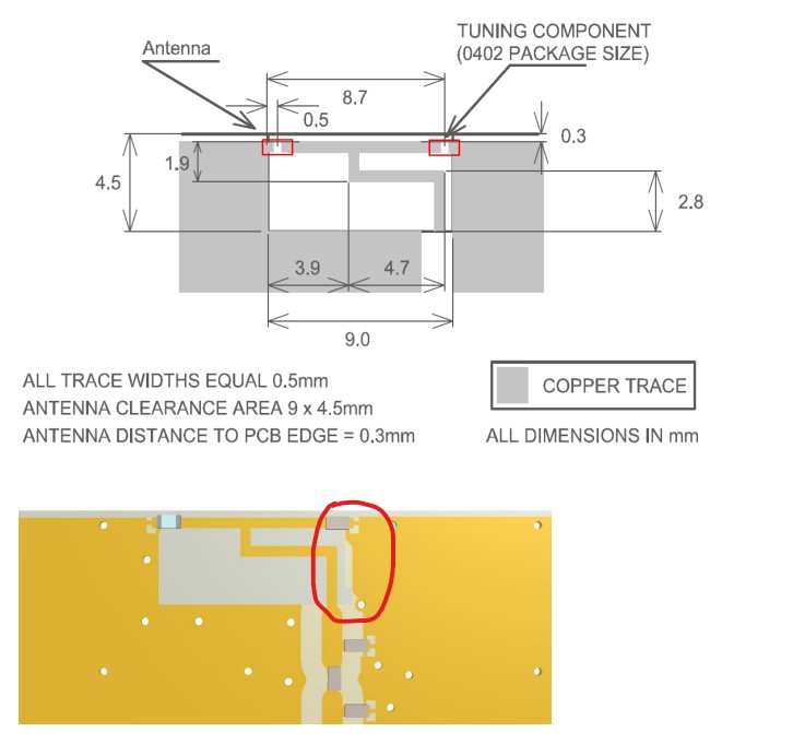 I am putting the SRCW004 on my board. The datasheet measurements don't match what is shown in either the datasheet images or the footprint provided on your website for download. For example, the image below shows the area in red does not match. The top layer copper is much further back than 0.3mm. The other layers below seem to have a proper clearance except for the square area at the bottom right near the input feed line that sticks out.